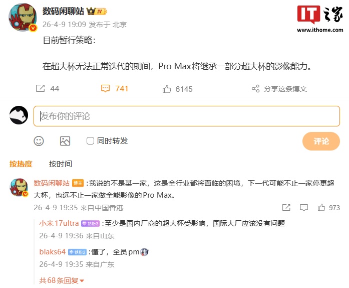 IT之家注意到,有爆料称因为内存价格暴涨,下一代可能有超大杯停更…… 而这是全行业都将面临的困境,下一代可能不止一家停更超大杯,也远不止一家做全能影像的 Pro Max。目前暂行策略是在超大杯无法正常迭代的期间,Pro Max 将继承一部分超大杯的影像能力。