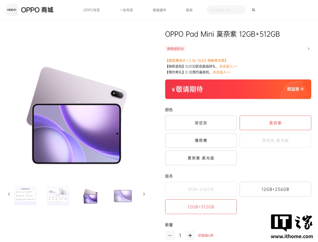 OPPO Pad Mini 小平板已现身官网,并公布了部分配置信息。据介绍,新平板将分为普通版和柔光版两种版本(预计是屏幕方面的差异),并提供 8GB+256GB、12GB+256GB、12GB+512GB 三种规格。