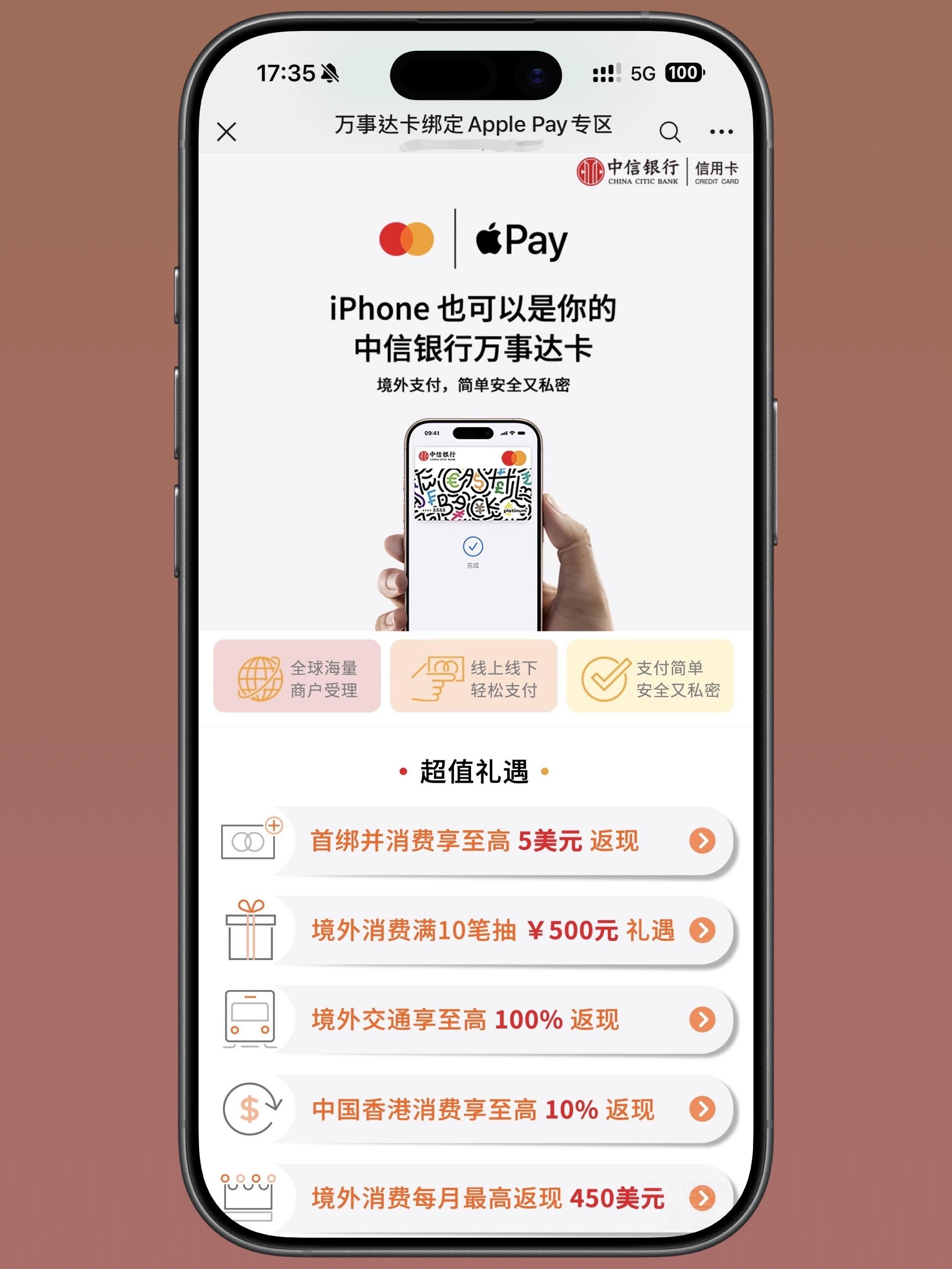 同时,中行还公布了万事达卡 Apple Pay 境外消费返消费金的活动,届时苹果用户可将其万事达信用卡添加至 Apple 钱包参与消费活动。