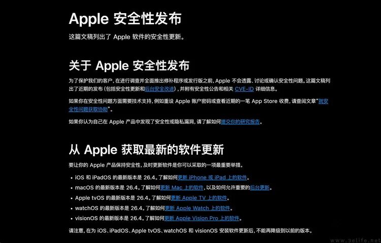 2026年4月15日,苹果方面发布系统更新,针对旧版系统受到网页攻击的情况,推出了涵盖iOS15到iOS26的针对性安全更新,为大量新老设备提供了漏洞修复与攻击阻断。