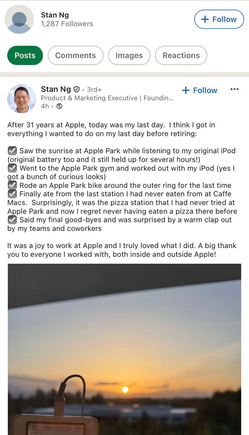 “在苹果工作31年后,今天是我在职的最后一天。能在苹果工作是一件幸事,我由衷热爱自己所从事的事业。”斯坦·吴写道。
