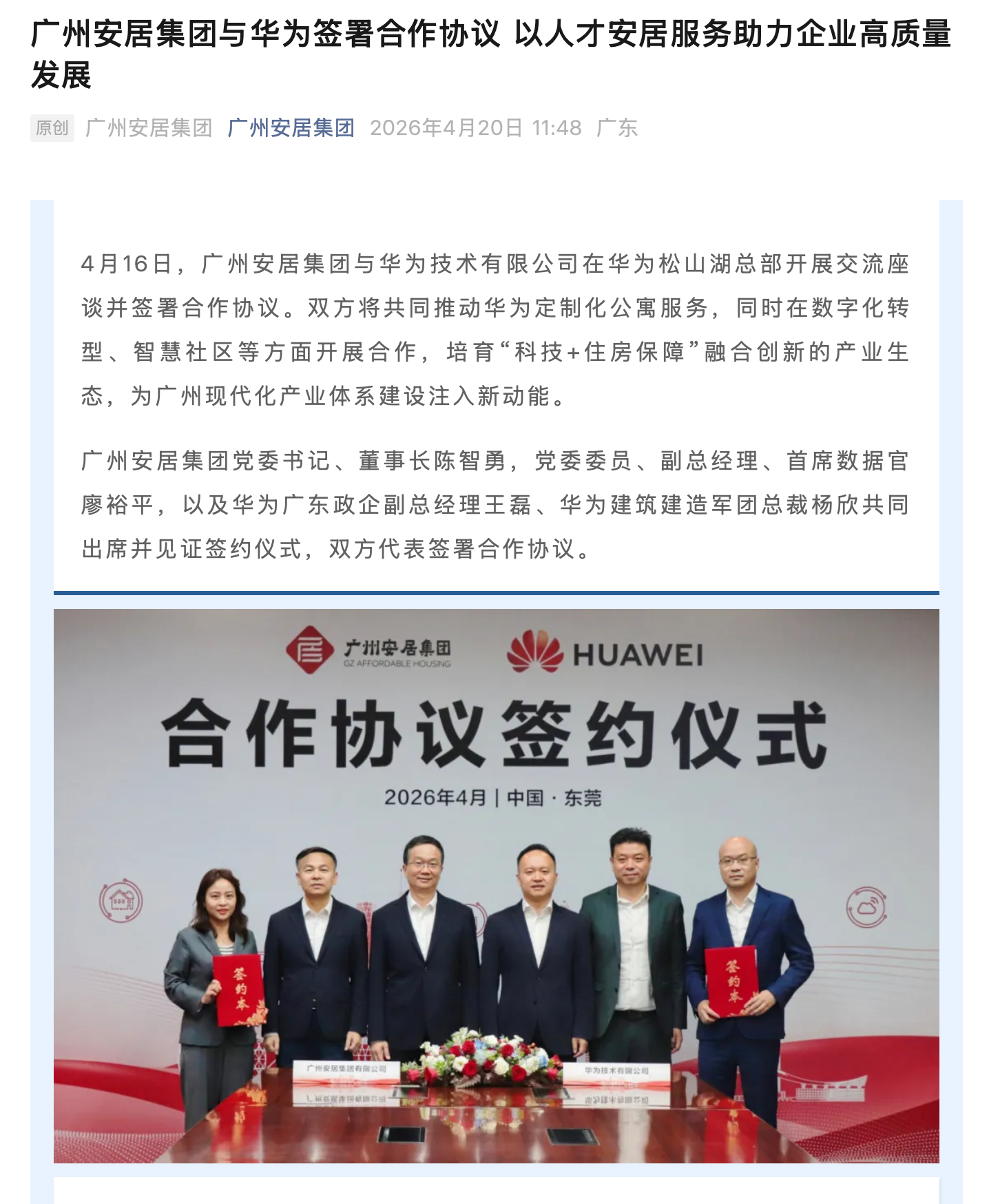 4 月 20 日消息,广州安居集团今日公布,4 月 16 日,广州安居集团与华为技术有限公司在华为松山湖总部开展交流座谈并签署合作协议。双方将共同推动华为定制化公寓服务,同时在数字化转型、智慧社区等方面开展合作。