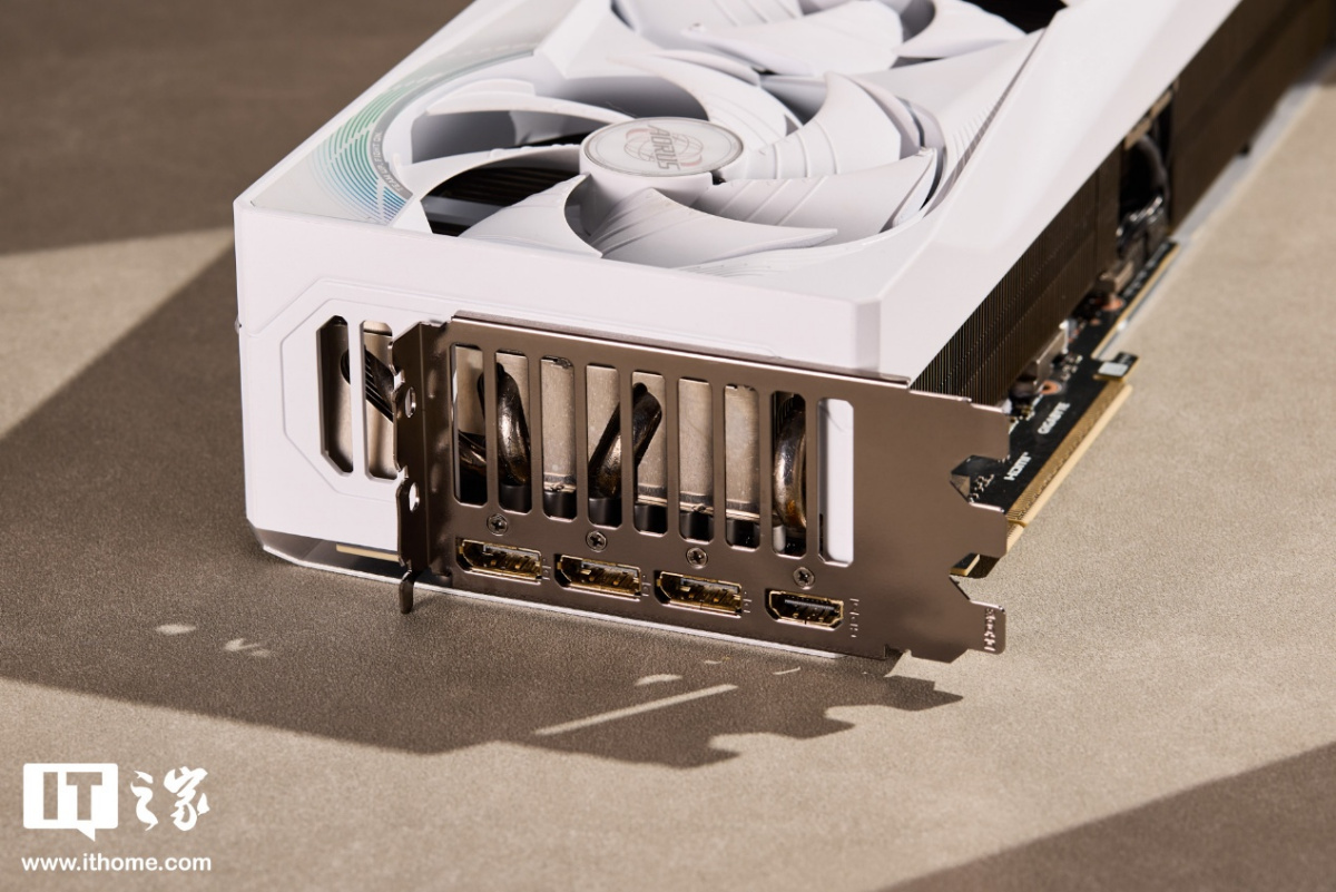 显卡的 I/O 接口面板提供了 3 个 DP 2.1b 接口和 1 个 HDMI 2.1b 接口,挡板采用了越肩设计,加上显卡本身的四槽厚度,整体还是比较厚实的。