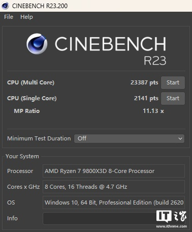 锐龙 7 9800X3D 在「标准」模式下单线程得分 2141 分,多线程得分 23387 分;