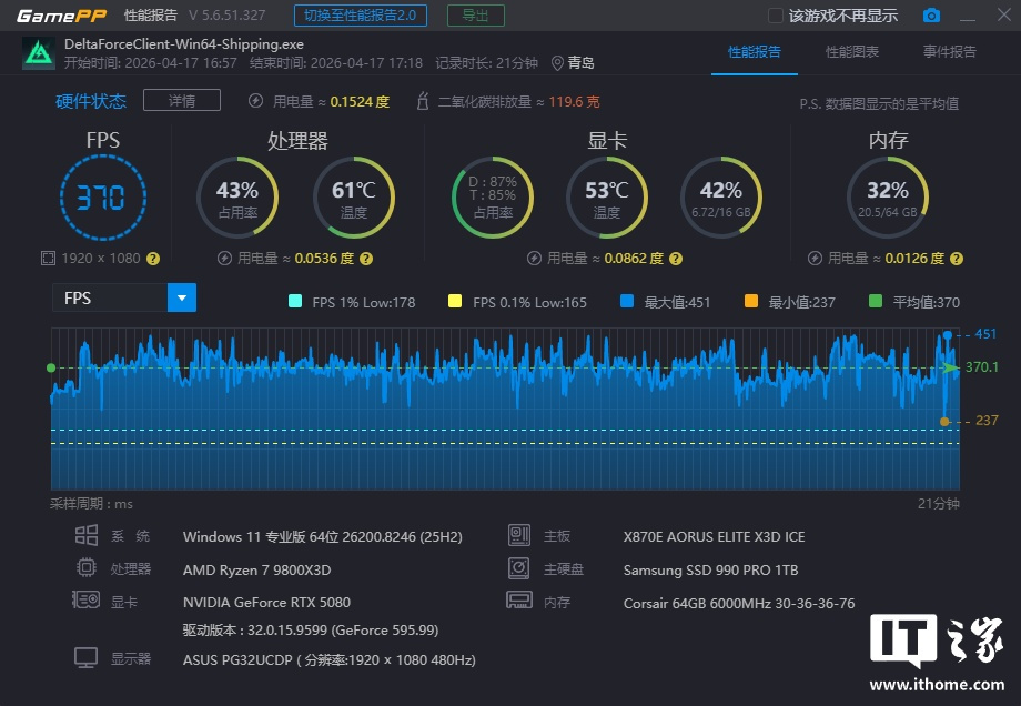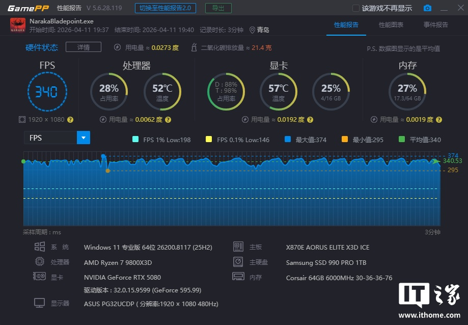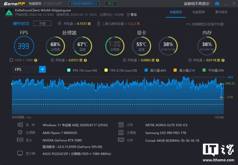 锐龙 7 9800X3D 在「极限游戏」模式下游戏平均帧数为 399 帧,1% Low 为 194 帧;