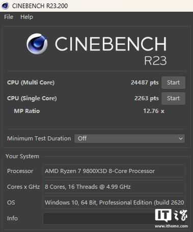 锐龙 7 9800X3D 在「最大性能」模式下单线程得分 2263 分,多线程得分 24487 分。