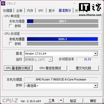 锐龙 7 9800X3D 在「最大性能」模式下单线程得分 888 分,多线程得分 9265 分。