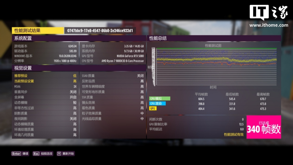 第五款游戏是《极限竞速:地平线 5》,以 1080P 分辨率 + 高画质 + MSAA 2x 抗锯齿预设,运行自带基准测试:
