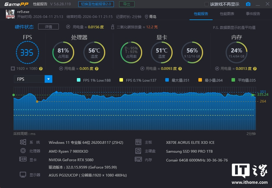 锐龙 7 9800X3D 在「极限游戏」模式下游戏平均帧数为 335 帧,1% Low 为 188 帧;