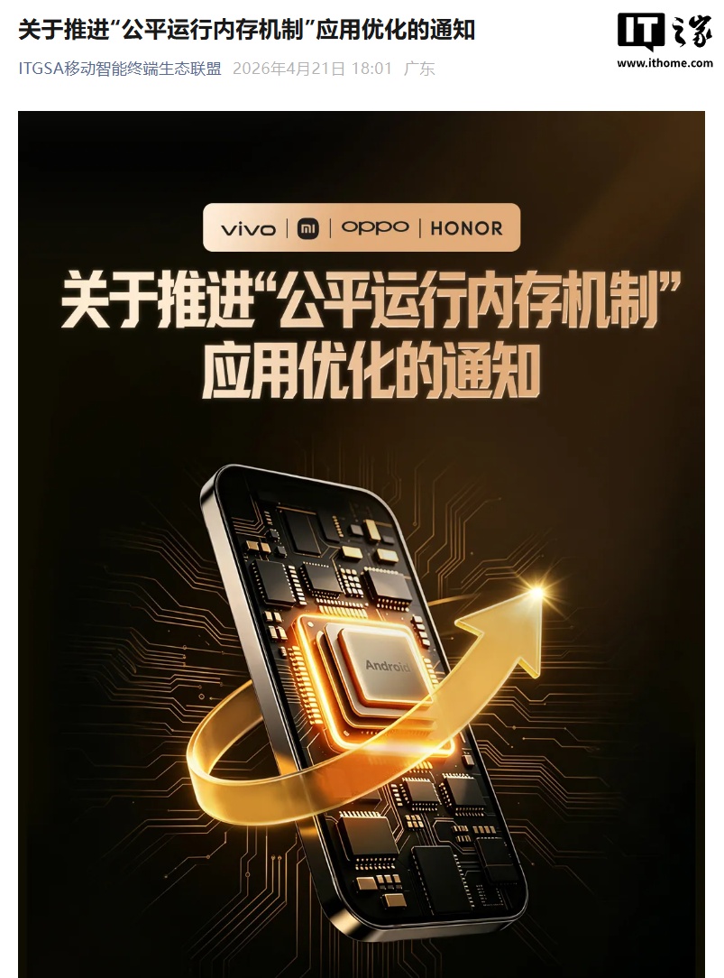 IT之家 4 月 22 日消息,ITGSA 移动智能终端生态联盟(金标联盟)4 月 21 日晚发布关于推进“公平运行内存机制”应用优化的通知。