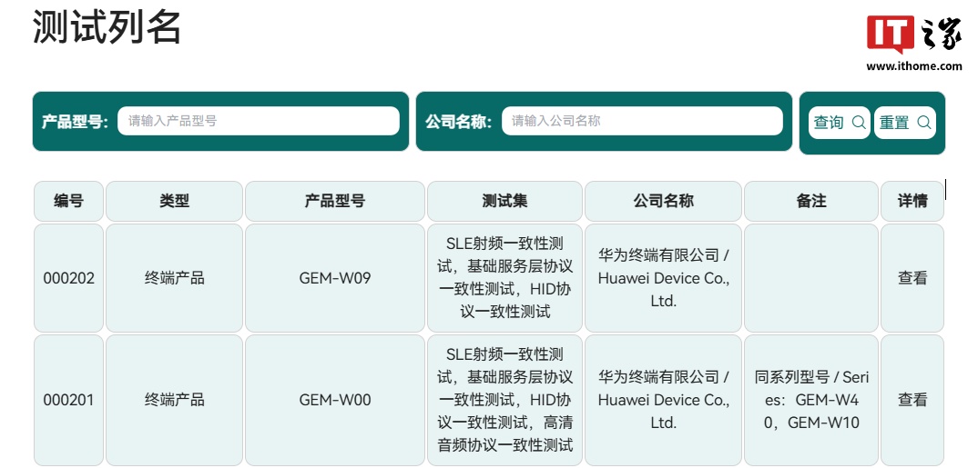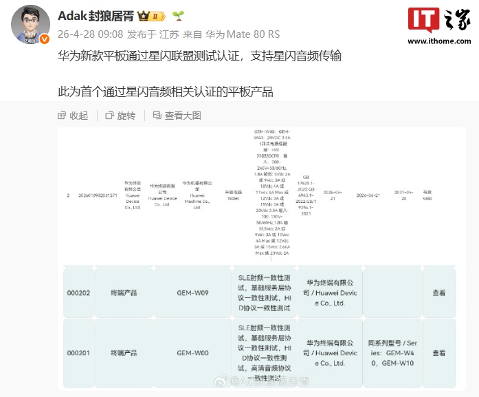 IT之家 4 月 28 日消息,国际星闪联盟官网显示,型号为 GEM-W09、GEM-W00 的华为终端产品已通过星闪认证,测试集包括 SLE 射频一致性测试、基础服务层协议一致性测试、HID 协议一致性测试、高清音频协议一致性测试等。