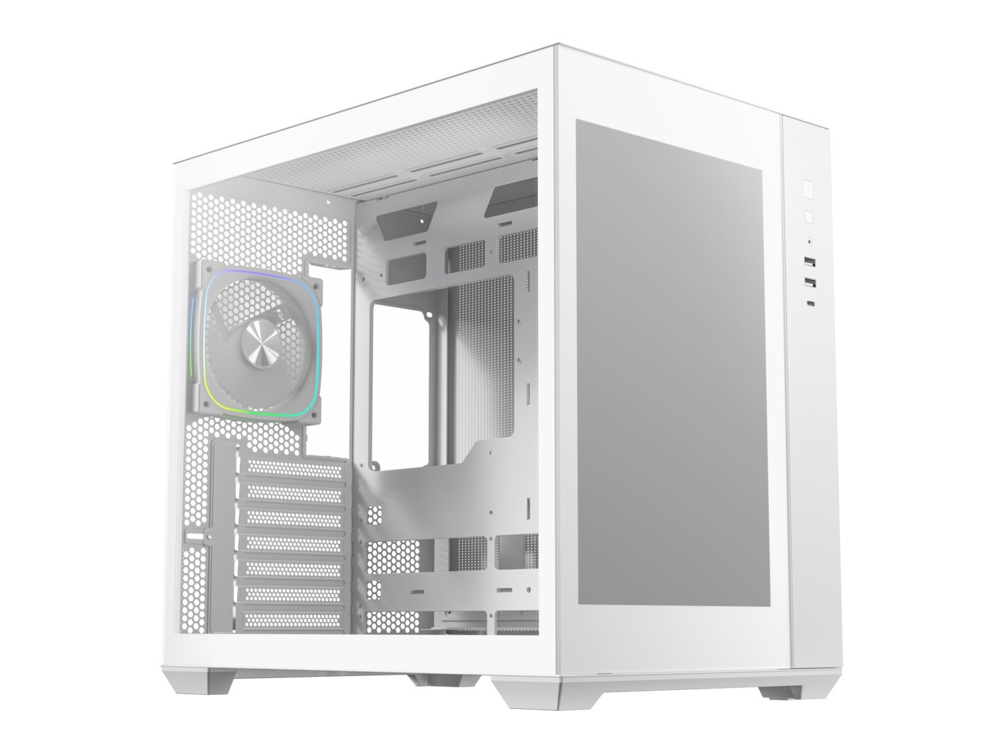 其顶部与右侧前方兼容 360 / 280 规格冷排,底部也能安装 3 颗 120mm 风扇或 2 颗 140mm 风扇,尾部则支持 120mm 风扇或冷排,此外顶部和底部均配有可拆卸的防尘网。前置 I/O 方面该机箱具备 2 个 USB-A 5Gbps 和 1 个 USB-C。