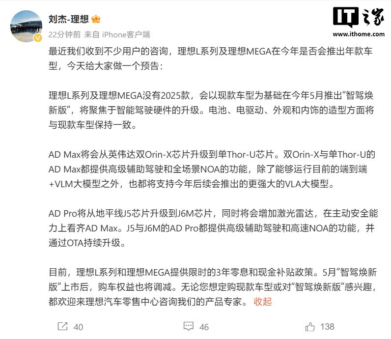 IT之家 2 月 28 日消息,理想汽车副总裁刘杰今日在微博透露,理想 L 系列及理想 MEGA 没有 2025 款,会以现款车型为基础在今年 5 月推出“智驾焕新版”,将聚焦于智能驾驶硬件的升级。电池、电驱动、外观和内饰的造型方面将与现款车型保持一致。