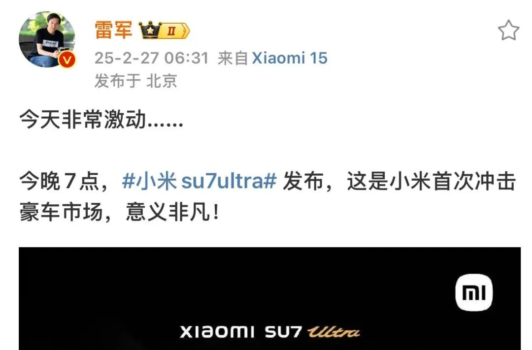 2月27日晚间7点,小米发布号称“创业十五年以来最高端的两款产品”,即小米SU7 Ultra以及小米 15 Ultra。