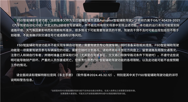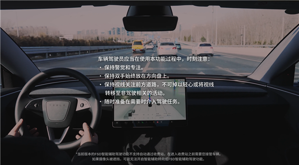 使用 FSD 智能辅助驾驶功能时,驾驶员注意力监测系统将会同时启用,以提供声音提醒,提示注意路面情况。