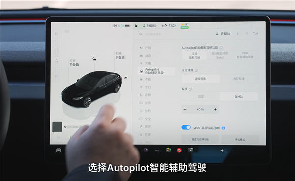 进入车辆后,点击控制,选择 Autopilot 智能辅助驾驶,选择启用 FSD 智能辅助驾驶,仔细阅读此处弹出的智能辅助转向功能介绍,确认无误后,点击“是”开启智能辅助转向功能。