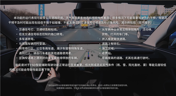 能见度对于 FSD 智能辅助驾驶功能正常运行至关重要,低光照或恶劣天气条件,雨雪阳光直射雾等能见度较低的情况,可能会导致性能显著下降。