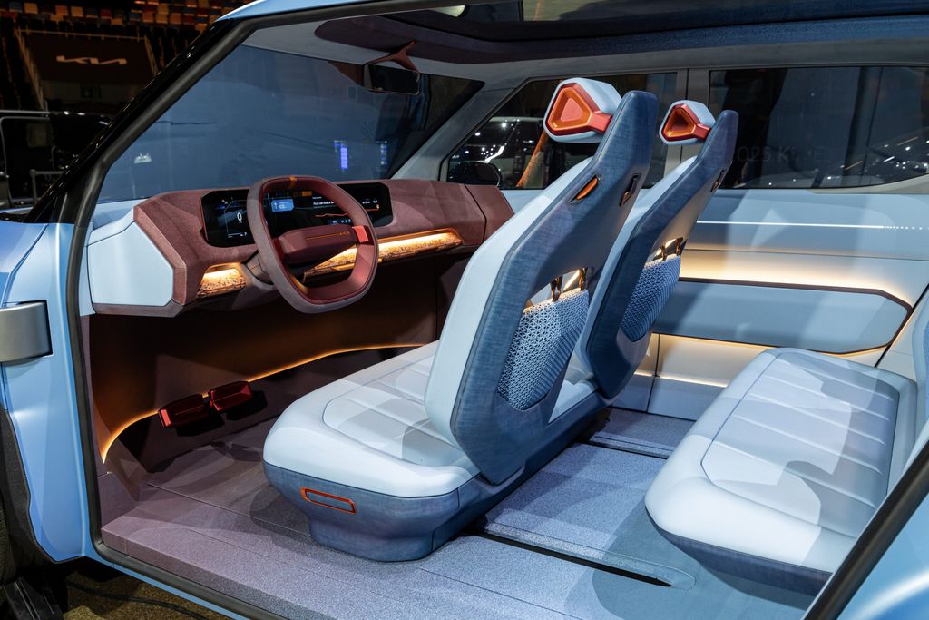 内饰方面,起亚 EV2 秉持极简主义和可持续发展的理念,大量采用回收和环保材料,布局强调空间效率,无缝连接数字仪表盘和直观的娱乐信息系统。