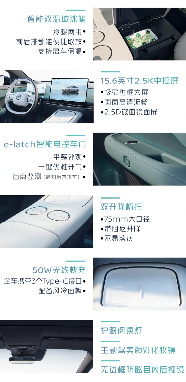 智能化方面,该车配备 AI 零压云毯座椅、15.6 英寸 2.5K 中控屏、50W 无线快充、3 个 Type-C 接口、双升降杯托。智能双温域冰箱冷暖两用,支持离车保温;e-latch 智能电控车门,支持盲点监测(感知后方来车)。