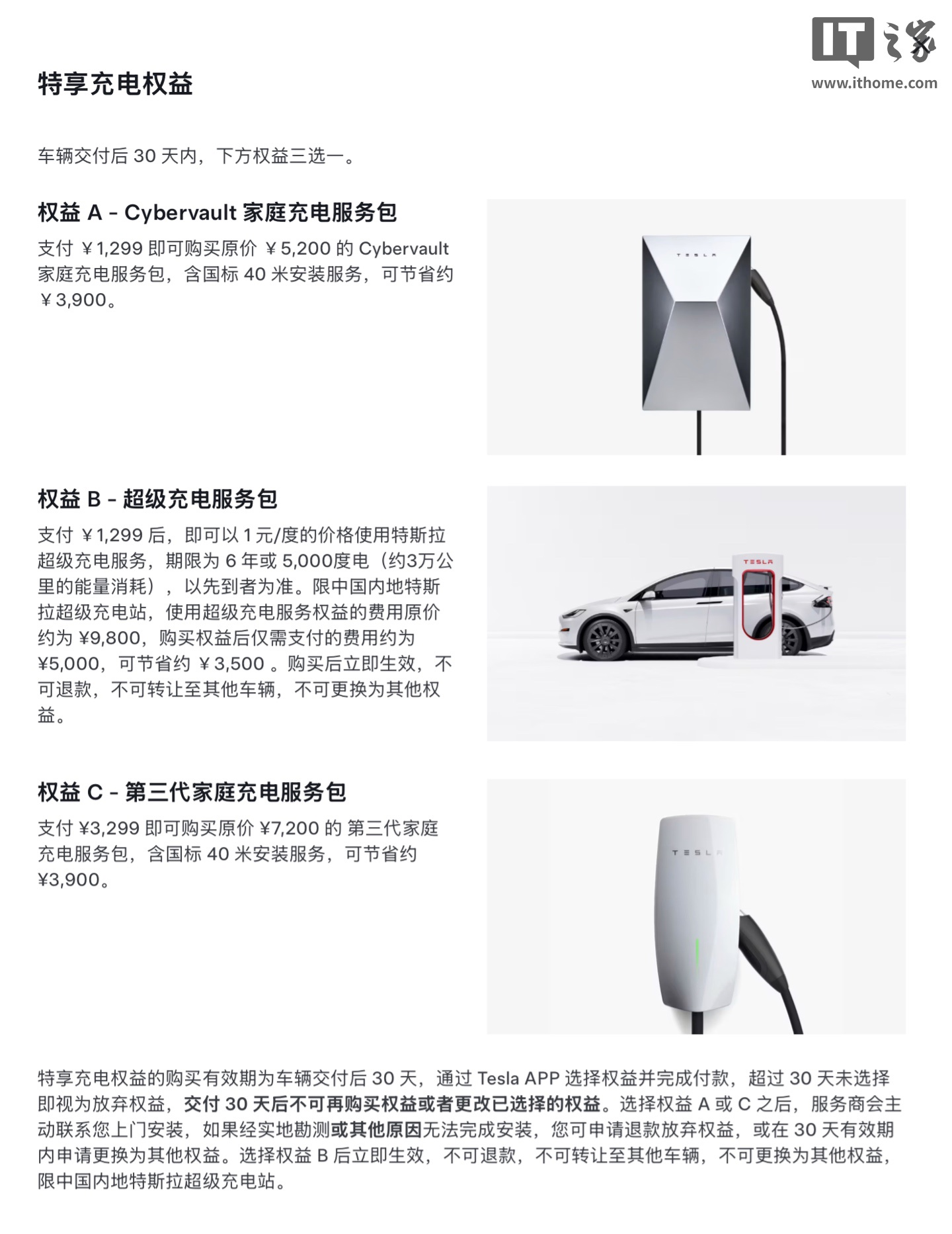 新车充电权益方面,目前特斯拉为其新增“三代家充(第三代家庭充电服务包)”选项,车辆交付后 30 天内,下方权益三选一。