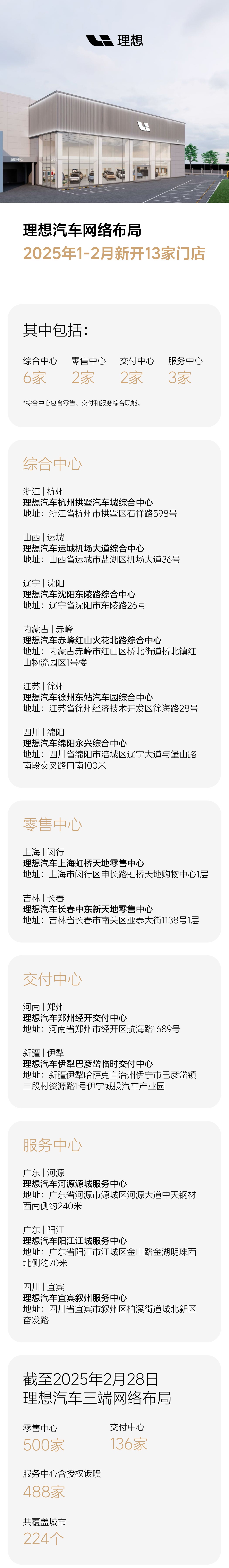 IT之家 3 月 2 日消息,理想汽车昨日晚公布了网络布局新进展,其 2025 年 1-2 月新开 13 家门店。其中综合中心 6 家(综合中心包含零售、交付和服务综合职能)、零售中心 2 家、交付中心 2 家、服务中心 3 家。截至 2025 年 2 月 28 日,理想汽车三端网络布局如下:
