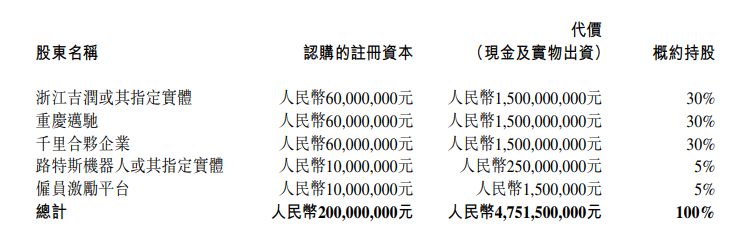 公告显示,订约方对合资公司的出资总额为人民币 47.515 亿元,其中人民币 2 亿元将入账列为合资公司的注册资本,结余 45.515 亿元将入账列为合资公司的资本公积,其中浙江吉润注资 13 亿元,浙江吉润及其联属人士应保留于成立合资企业后继续免费将该等技术用于其自身的智驾业务的权利。