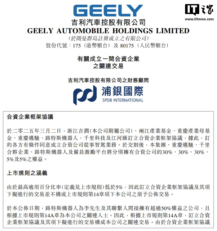 IT之家 3 月 3 日消息,吉利汽车今日发布公告,宣布浙江吉润 (公司附属公司)、两江产业基金、重庆产业母基金、重庆迈驰、路特斯机器人、千里科技、江河汇于 2025 年 3 月 2 日订立合资企业框架协议,订约各方有条件同意成立合资公司从事智驾业务。