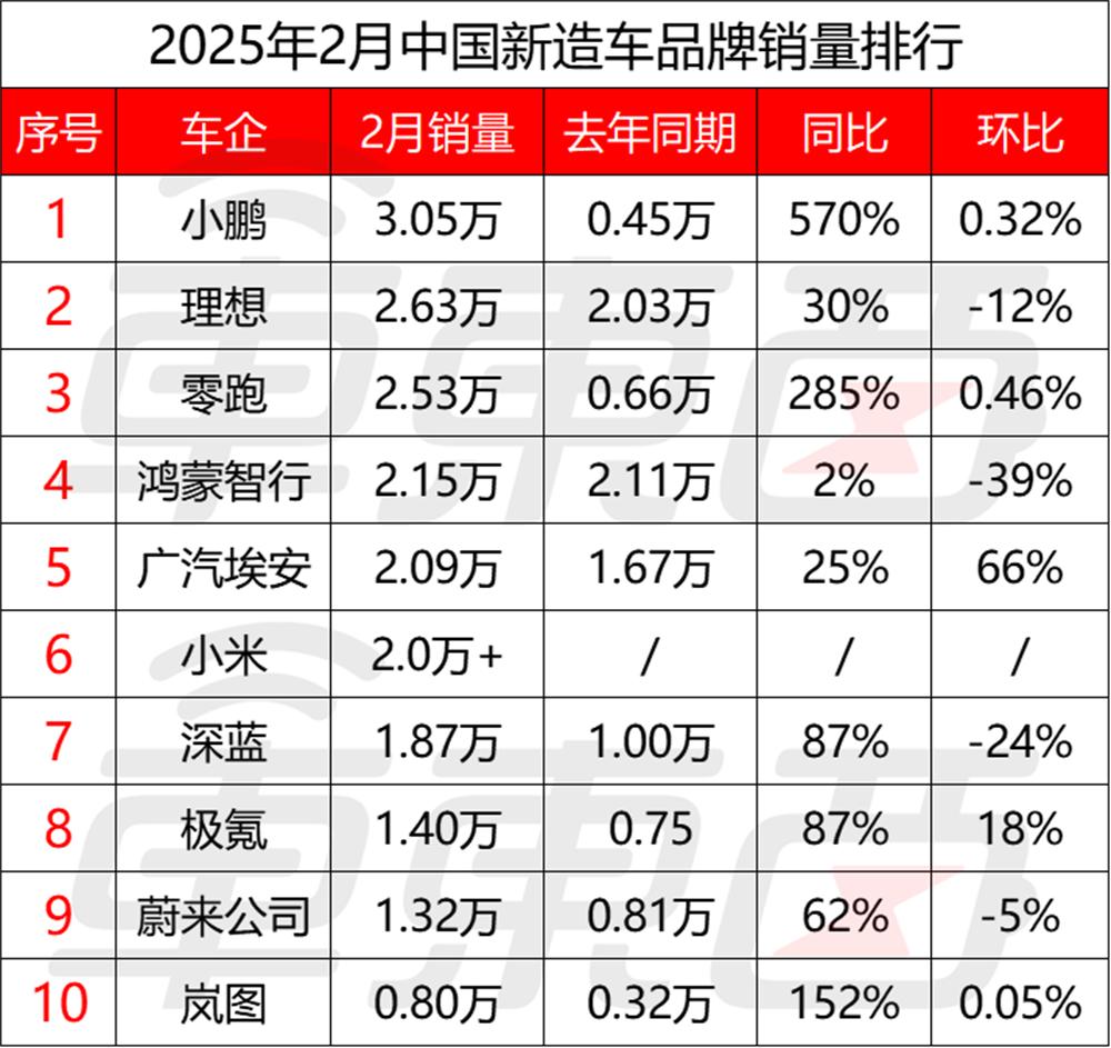 而小鹏2月卖车3.05万台,凭借MONA M03、P7+两款爆款车,又一次抢位理想,拿下中国新造车销冠。