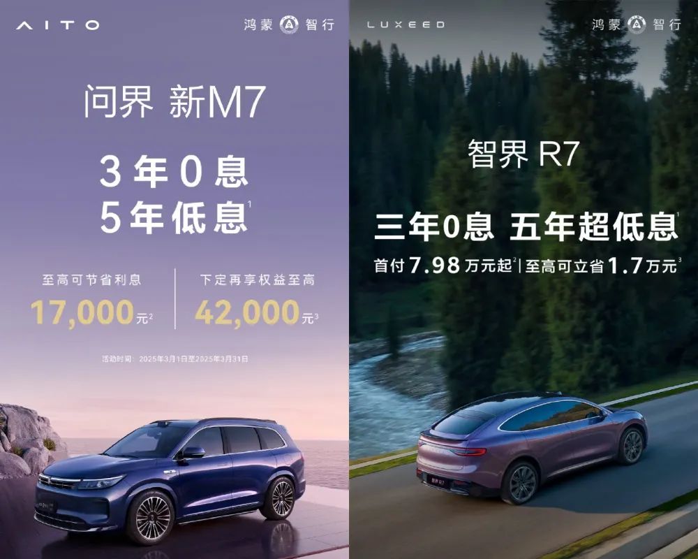 鸿蒙智行今天也加速发牌了,问界M5 Ultra开启预订,智界R7、新问界M7也都开始促销催单了,推出三年免息及高达1.7万元的优惠措施。