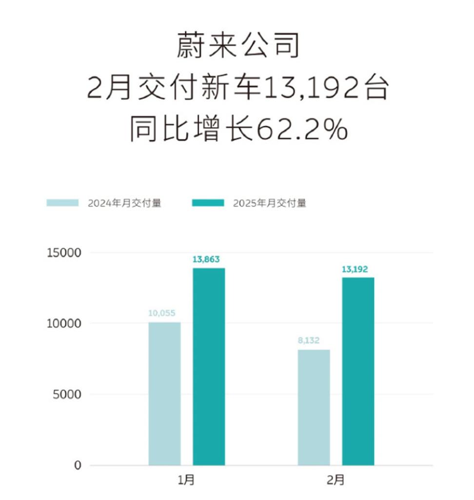 蔚来也在下午交卷月销,2025年2月,蔚来公司交付新车1.32万台,同比增长62.2%,环比下滑5%,比上个月少700台左右。