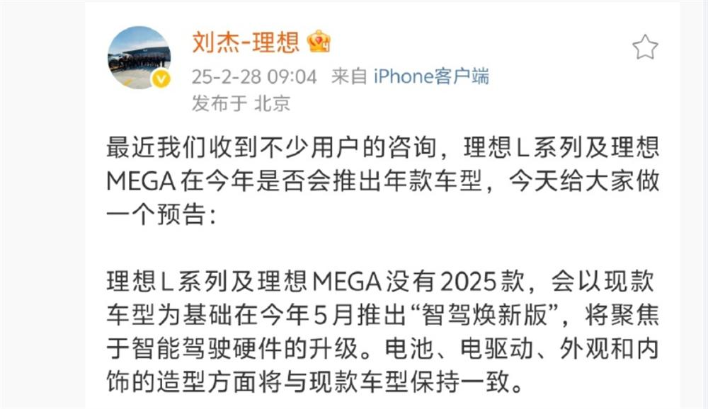 ▲官方确认理想L系列/MEGA将推出智驾焕新版