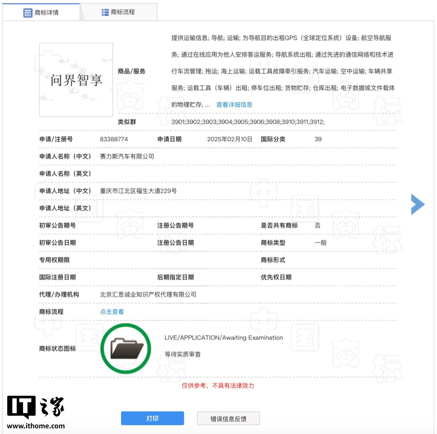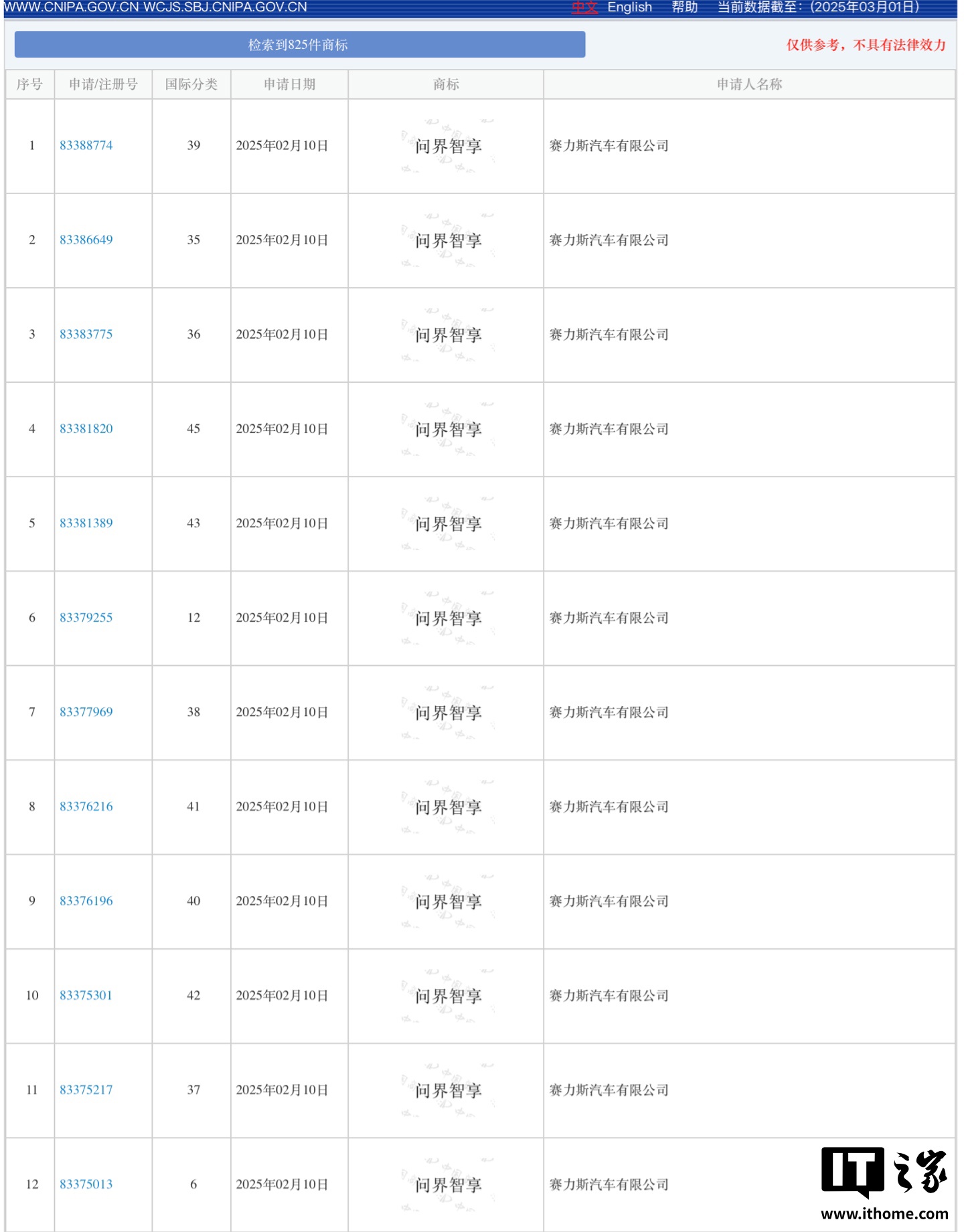 IT之家 3 月 3 日消息,国家知识产权局商标局(中国商标网)显示,赛力斯汽车有限公司在 2 月 10 日申请注册多枚“问界智享”商标,国际分类涉及 39、35、36、45、43、12、38、40、41、37、6,包含“运输工具、教育娱乐、金融物管”等。