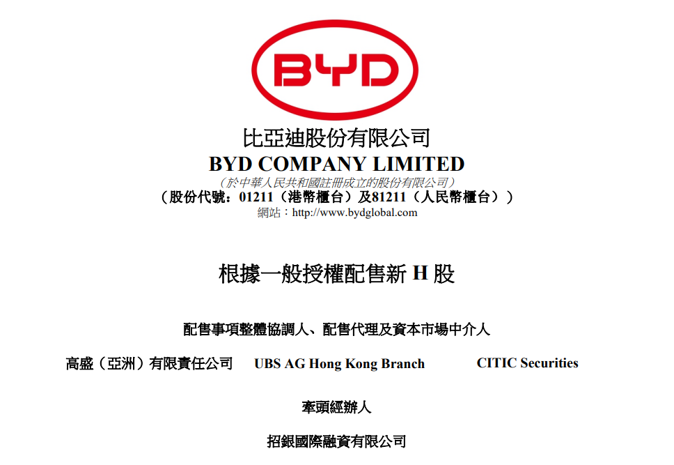 比亚迪股份公告称,配售所得款项净额拟用作集团研发投入、海外业务发展、补充营运资金以及一般企业用途。