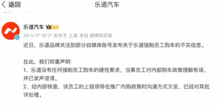 之后,又有消息传出,乐道逼员工买车后将其辞退,但乐道官方同样对此进行了辟谣,称该武汉地区的员工是“内购优惠购车后违规转卖”。