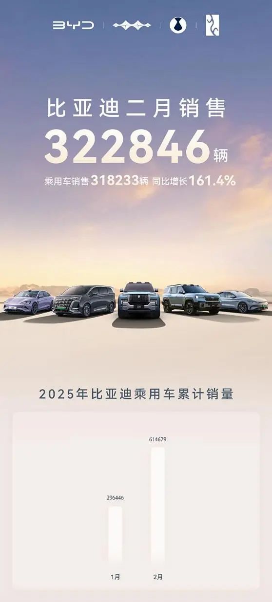 比亚迪2月销量322846辆同比增长164%,其中乘用车销售318233辆,同比增长161.4%。比亚迪2月王朝+海洋销售304673辆,同比增长167.1%。
