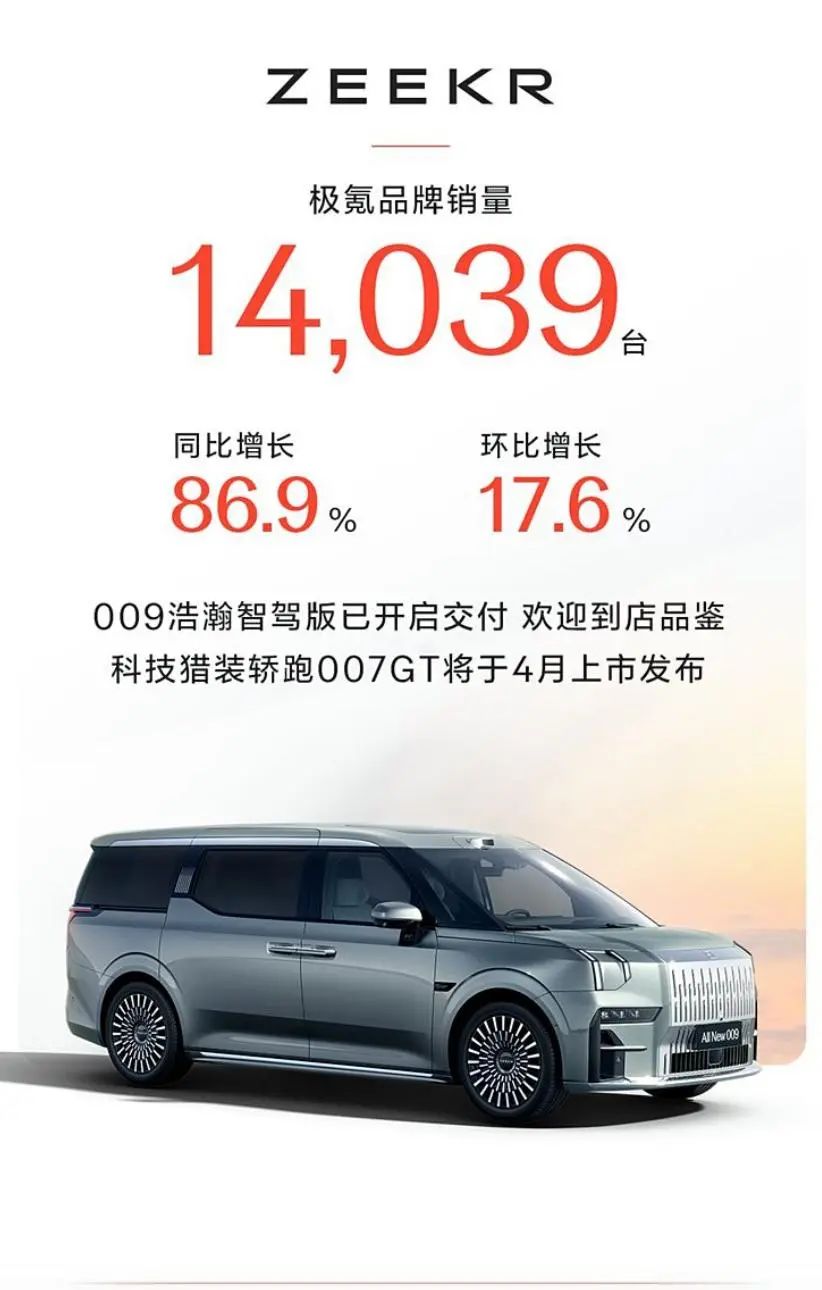 极氪科技集团公布2月销量,其中极氪品牌销量14039辆,同比增长86.9%,环比增长17.6%,极氪007GT将于4月上市。