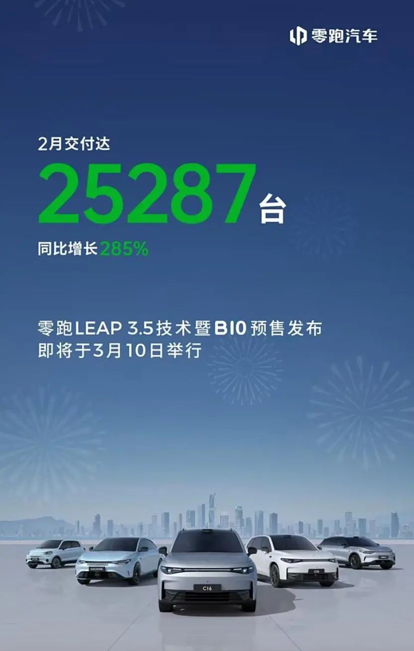 零跑汽车2月交付量达25287台,同比增长285%,零跑LEAP 3.5技术暨B10预售发布在3月10日举行。