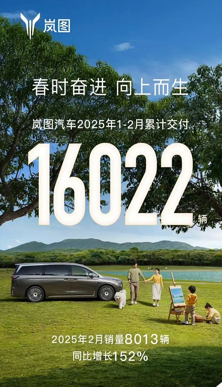 岚图汽车2025年2月销量8013辆 同比增长152%,岚图汽车2025年1-2月累计交付16022辆。