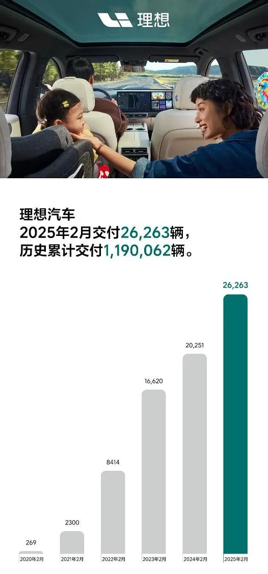 近期,理想汽车公布2025年2月交付数据,交付新车26263辆,同比增长29.7%。截至2025年2月28日,理想汽车历史累计交付量为1,190,062辆。