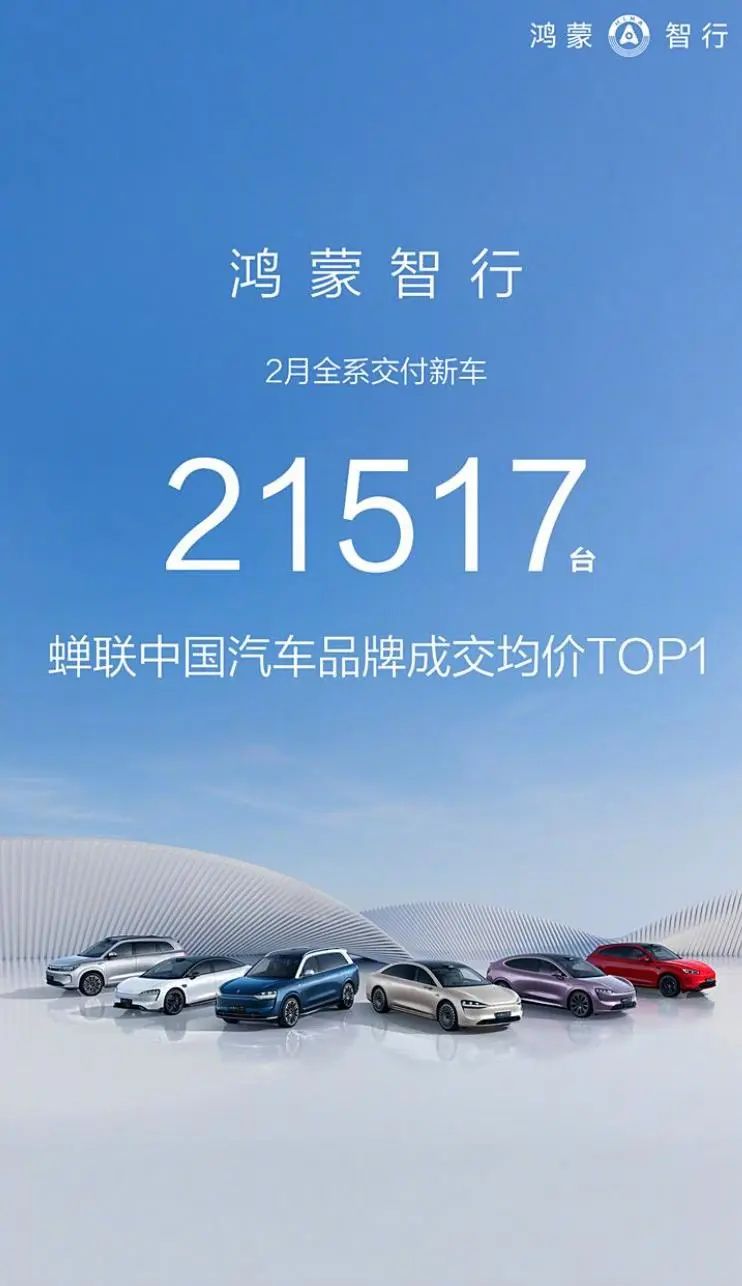 2025年2月鸿蒙智行全系交付新车21517辆,其中问界M7系列交付5204辆,智界R7 2月交付8748辆,2025年累计交付20168辆。