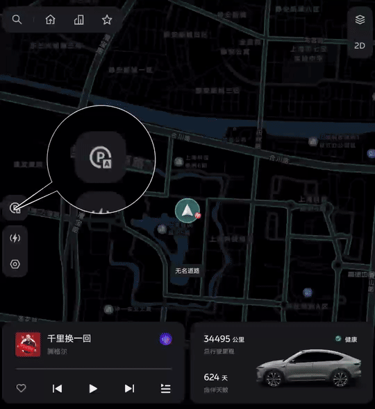 步骤一:在中控屏打开辅助泊车界面后,点击屏幕左下的“随心停”按钮,即可激活功能。