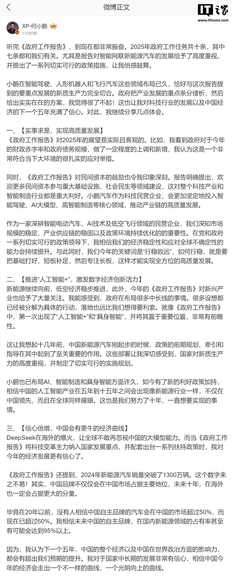 IT之家 3 月 7 日消息,小鹏汽车董事长何小鹏今日下午发布长文,“听完《政府工作报告》,到现在都非常振奋。2025 年政府工作任务共十条,其中七条都和我们有关。尤其是报告对智能网联新能源汽车的发展给予了高度重视,并提出了一系列切实可行的政策措施,让我倍感鼓舞。”他表示,对科技行业的发展以及中国经济的下一个五年充满了信心。