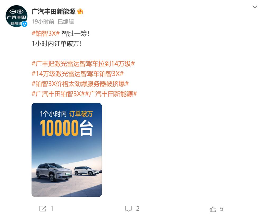 ▲广汽丰田宣布铂智3X1小时内订单破万