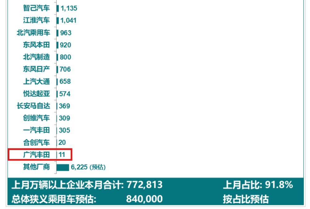 另一方面,从销量上看,根据乘联会公布的2025年2月乘用车主力厂商新能源批发销量,广汽丰田在2月一整个月只卖出了11辆,在榜单的最后一位。