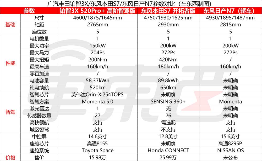 ▲广汽丰田铂智3X/东风本田S7/东风日产N7参数对比