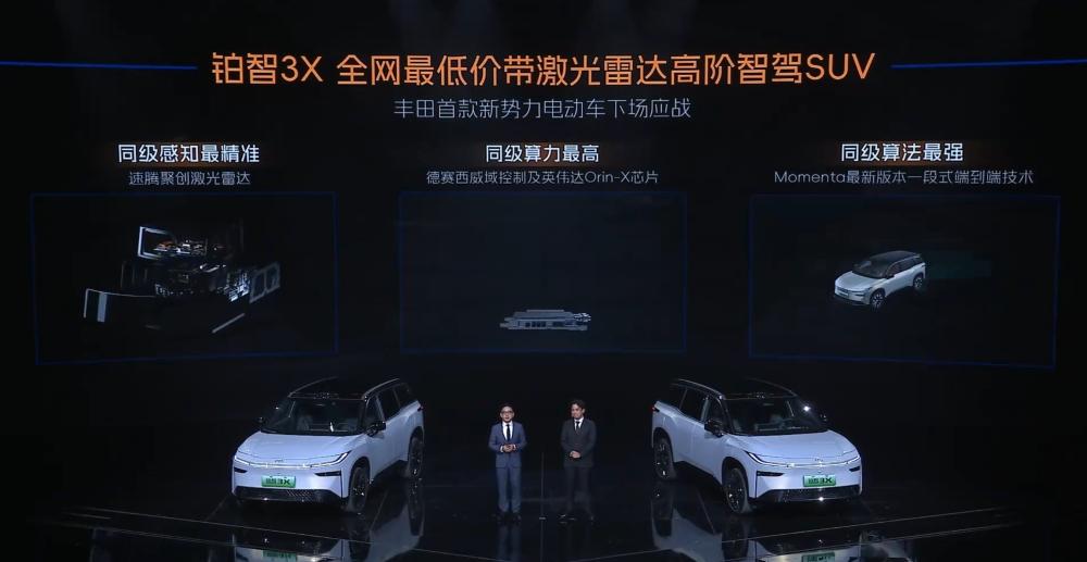 其他智驾配置方面,广汽丰田表示,铂智3X高阶智驾版采用了速腾聚创激光雷达,德赛西威域控及英伟达Orin-X芯片,同时还强调了算法为Momenta最新版本,采用了一段式端到端技术。