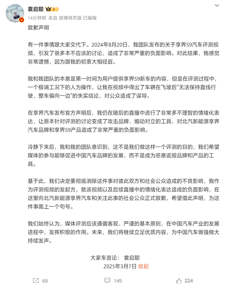 IT之家 3 月 7 日消息,“大家车言论”车评人袁启聪今日发布“致歉声明”,就去年 8 月发布的享界 S9 汽车评测视频造成的负面影响致歉。