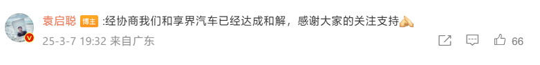 袁启聪在评论区表示:“经协商我们和享界汽车已经达成和解,感谢大家的关注支持。”
