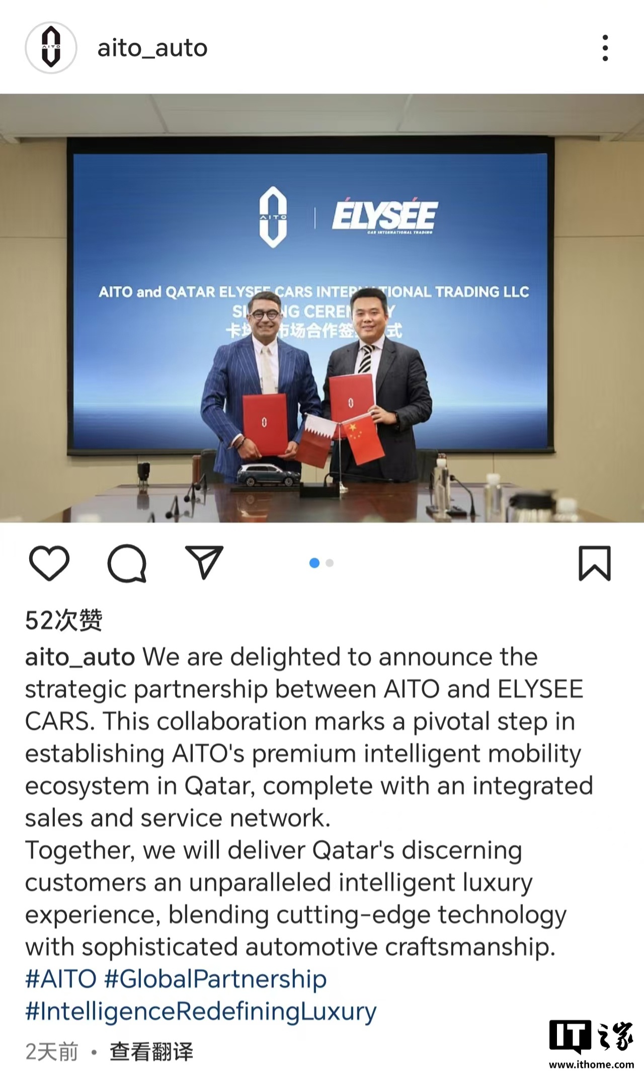 IT之家 3 月 9 日消息,AITO 问界本月发文宣布与 ELYSEE CARS 达成合作,官方称这项合作是其在卡塔尔建立拥有完整销售和服务网络的 AITO 高级智能移动生态系统关键一步。