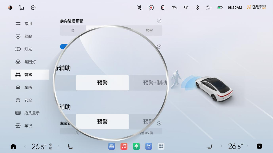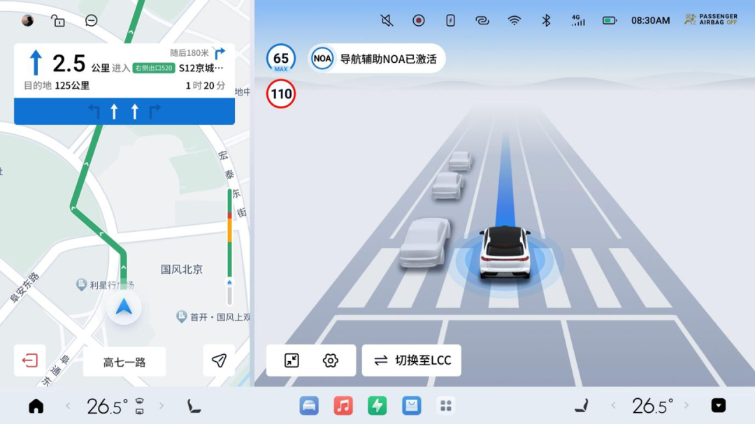 城区 LCC(城区车道居中辅助)功能也得到了进化。新增红绿灯通行,不仅支持根据红绿灯状态直行或转弯通过路口,在不开启导航或者 NOA 暂时未开通区域的城区地面道路行驶时,车辆可根据路口红绿灯信号自主通过路口;新增借道避障、自动汇入主路功能,在本车道前方因存在障碍物而不能通行时,系统会控制车辆借旁侧车道空间避障,避障完成后返回原车道,且在遇到路口车道合并或车道增多的场景时,车辆可自动汇入相邻可通行车道,使得车辆在城市道路常见的车道施工、车道交通事故等场景,通行效率更高。